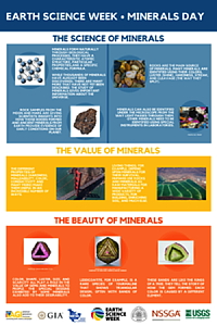 During this year's Earth Science Week (October 11-17) the American Geosciences Institute (AGI), Mineralogical Society of America (MSA) and several partners have organized a Minerals Day - Monday, October 12, 2020. A Minerals Day microsite has teaching resources, two downloadable posters, and the schedule of free on-demand or live webinars: "Advances in the Mineralogy of Mars," "The Future of Data-Driven Discovery in Mineralogy and Crystallography," "Resources Beyond Earth: Enabling Future Exploration and the New Space Economy "Gemology: Time Capsules Connecting Us Through History,” "The Need and Solutions for Robots in Responsible Raw Material Exploration and Mining,” "New Insights Into Wire Silver and Gold Formation”, "Consumers: The Most Potent Army Against Conflict Minerals," "May the Quartz Be With You," "The Global Supply of Critical Minerals: Assessing and Tracking Critical Mineral Commodities."