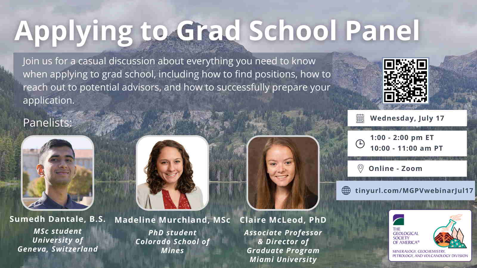 The Mineralogy, Geochemistry, Petrology and Volcanology division (MGPV) webinar series, organized by the MGPV Student Representatives, aims to provide resources for students in areas including career and professional development, graduate studies, and science communication. This bi-monthly series includes virtual panels and round table discussions geared towards fostering greater student engagement within the MGPV community. We welcome ideas for future webinars, as well as any suggestions for making this series more accessible to our community. Please reach out to mgpvstudentrep@gmail.com with your ideas.